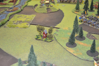 Moi dragoni już w domach, dwa skwadrony na lewej flance zbliżają się do rzeki. W centrum jeszcze nic się nie dzieje natomiast szwedzka piechota na moim prawym skrzydle powoli zblirza sie do rzeki.